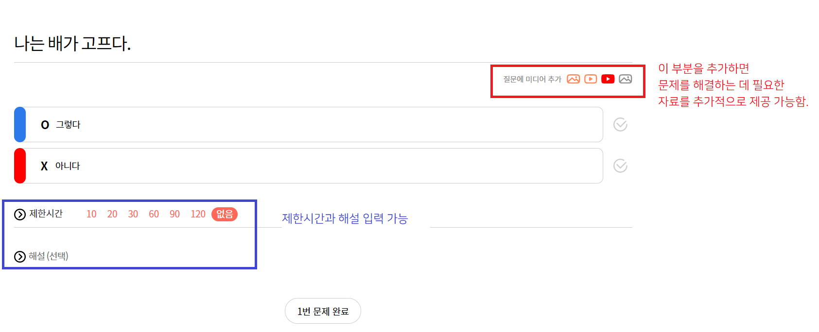 ** 문제 제작이 끝나면 1번 문제 완료를 클릭해 각각을 마무리 지어줍니다 . ** 반복합니다.