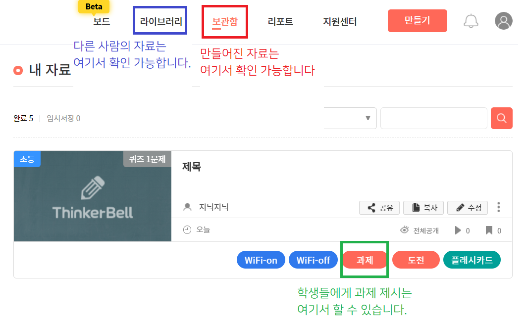 7. 띵커벨 페이지의 보관함으로 들어가면 만들어진 문제를 확인할 수 있습니다.