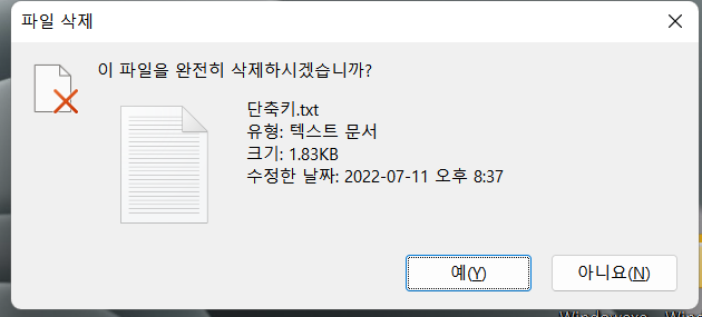 Shift+Delete : 선택한 항목을 휴지통에 넣지 않고 영구적으로 삭제