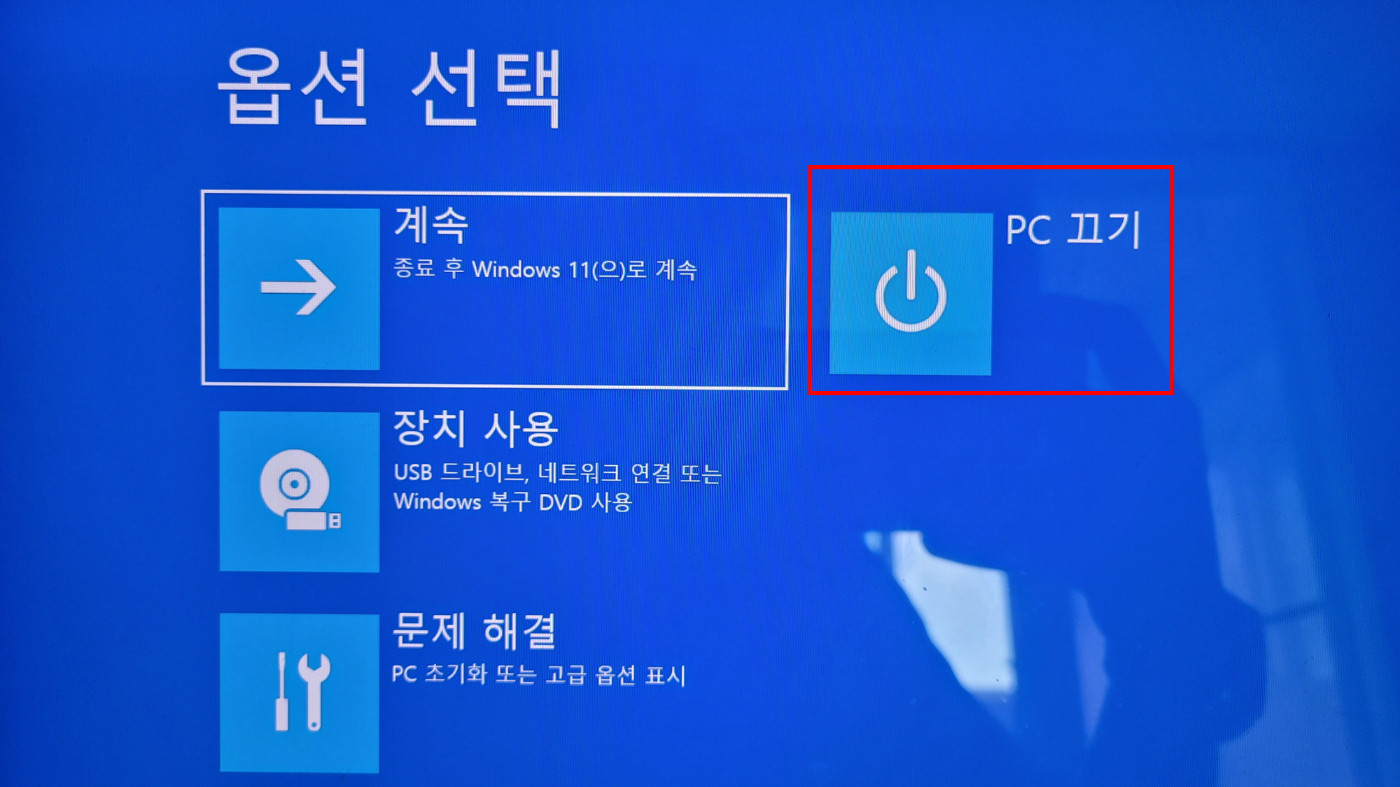 잠시 후 이런 화면이 뜨면, 화살표를 옮겨 PC 끄기에서 엔터를 눌려줍니다.