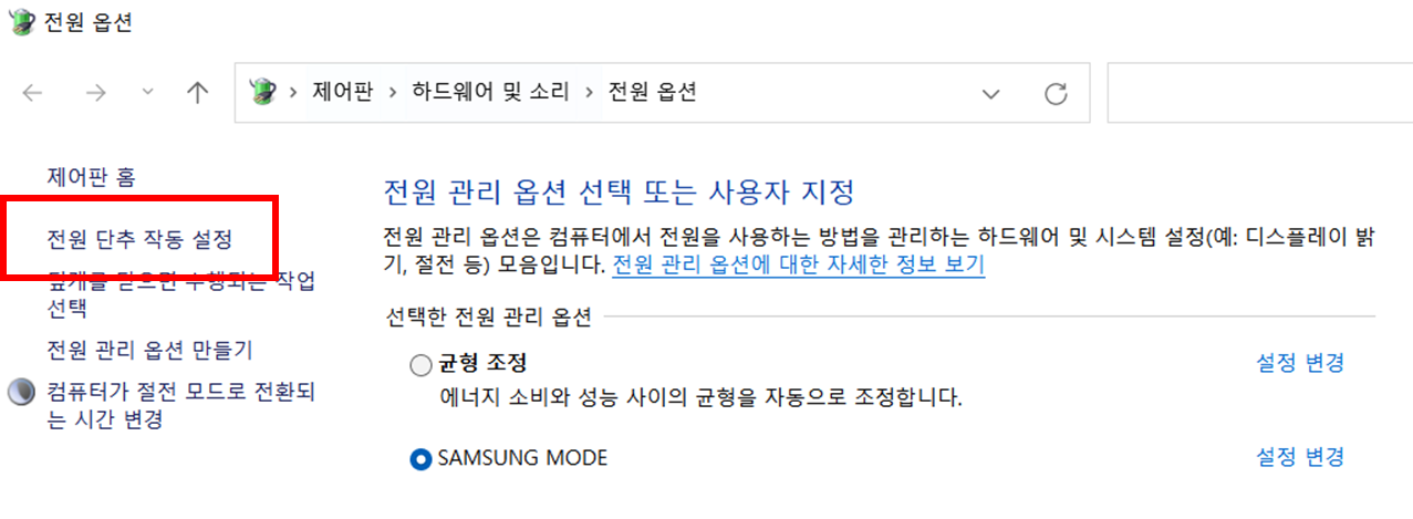 1. 윈도우 검색에 "전원" 을 검색하고, 전원 관리 옵션 선택을 클릭합니다.