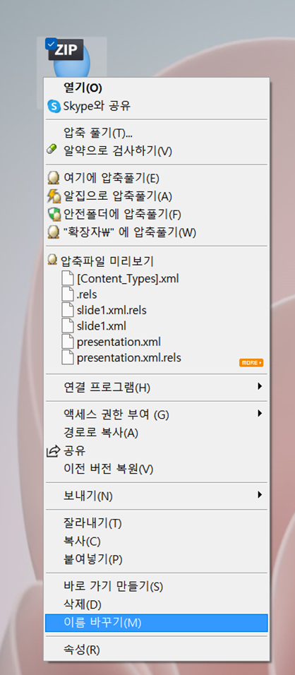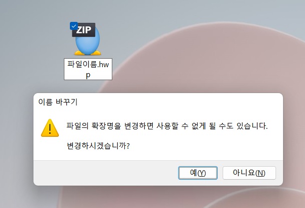 이 파일의 확장자( . 뒤에 있는 영문자 : hwp/ppt/exe/txt/zip 같은 것)을 바꾸고 싶습니다