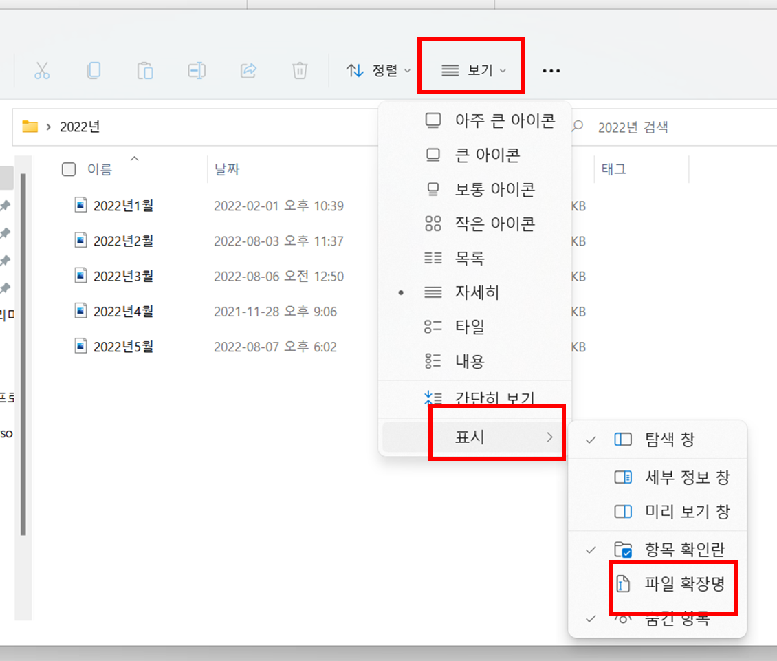 1. 아무 폴더에나 들어갑니다. 파일 확장명에 체크를 만들어줍니다.