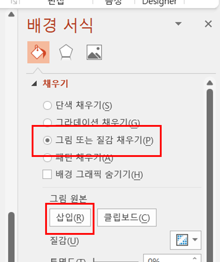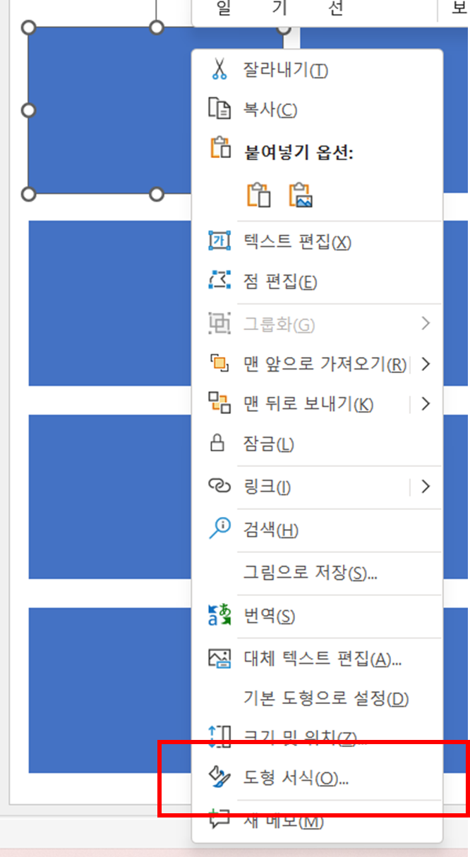 우측 마우스 클릭 후 도형 서식 -> 그림 또는 질감 채우기 -> 삽입 눌러서 원하는 사진(그림) 넣기