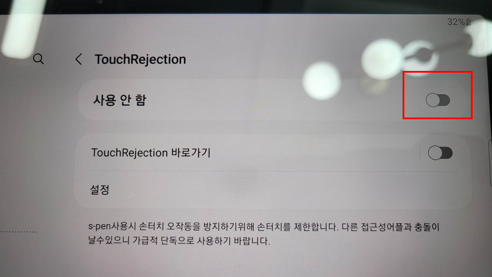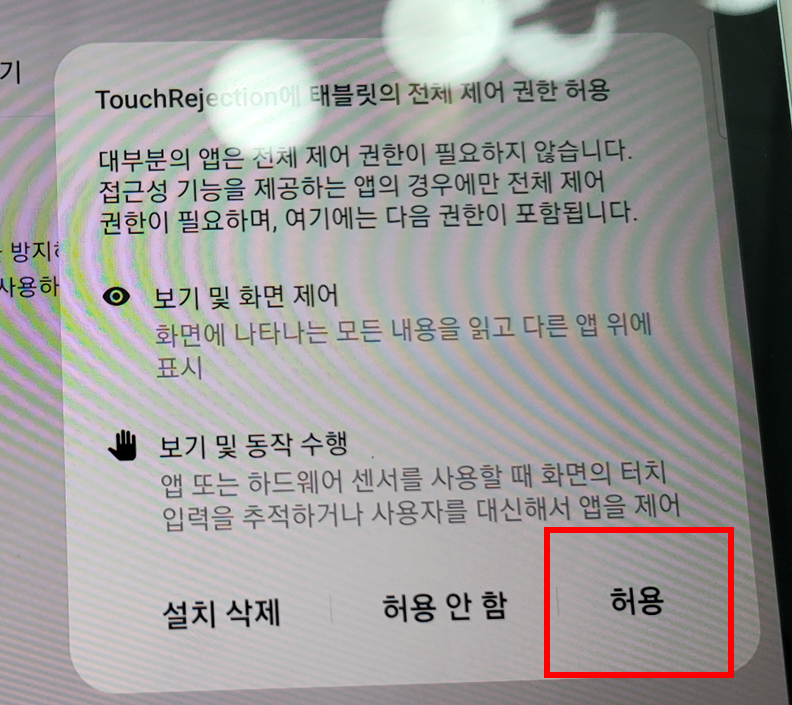 3. 어플 활성화 단계 2 : Touch Rejection > 사용 안 함 옆 버튼 > 제어 권한 허용 > 사용 중