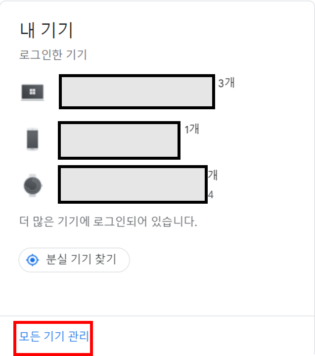 3. 스크롤 내리며, '내기기' 항목 찾기 > 모든 기기 관리 (기기 로그아웃 방법)