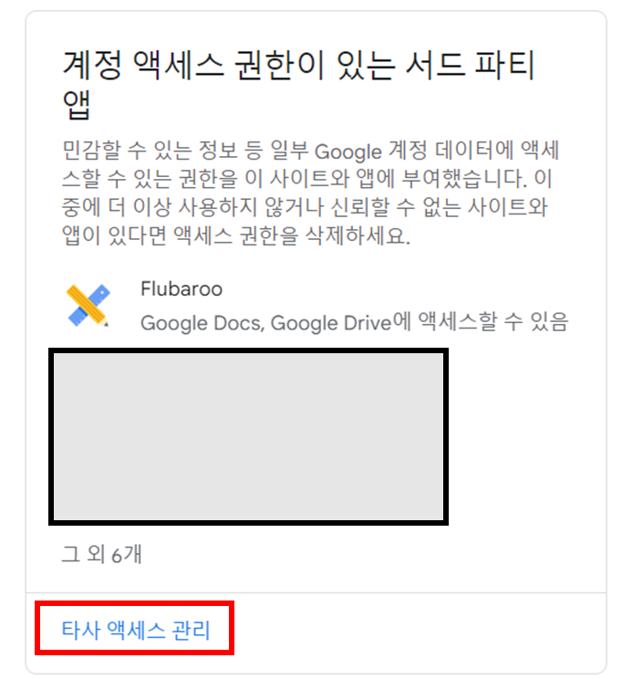 5. 스크롤 내리며 '서드 파티 앱' 찾기 > 타사 액세스 관리 (구글 데이터 연동 해제)