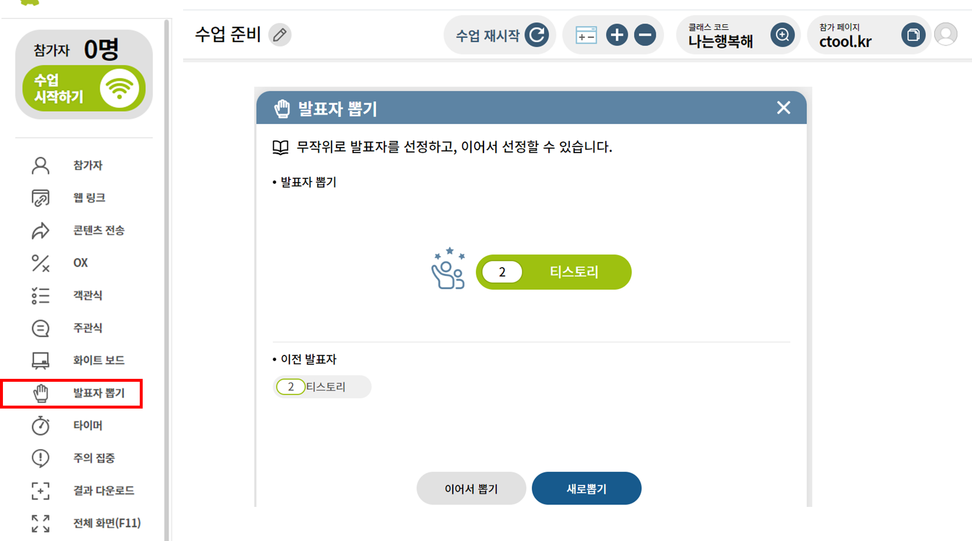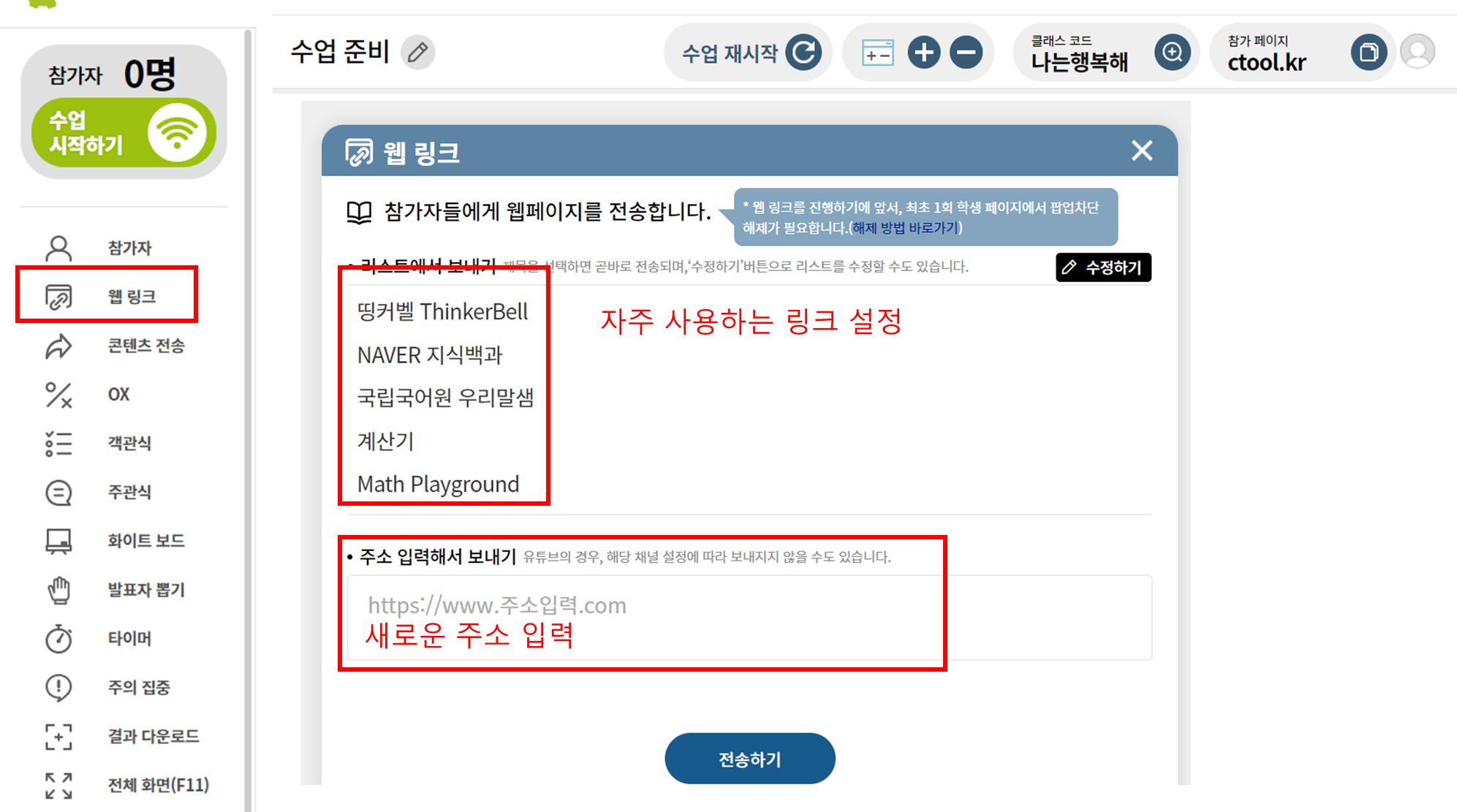 클래스툴 교사용 페이지. 학생의 스마트기기를 활용한 상호작용 수업도구.