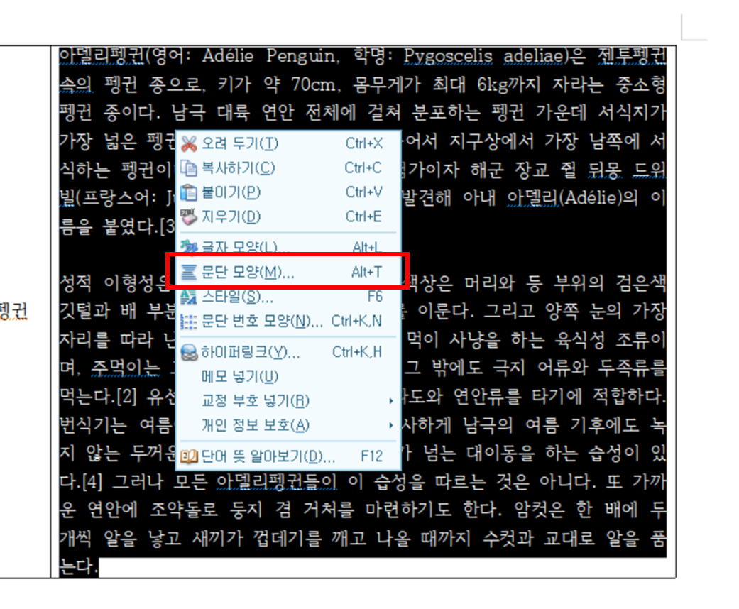 2. 해당하는 부분을 블록처리한 다음, 우측 마우스> 문단 모양
