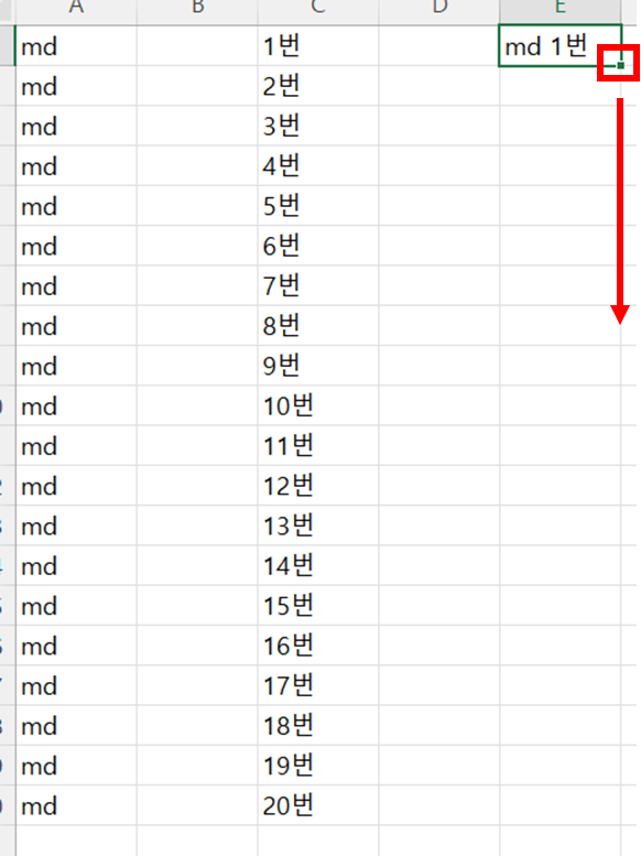 4. 핸들을 잡고 내려줍니다 > E열이 완성됩니다