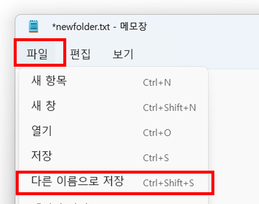 6. 메모장을 "newfolder.bat" 로 저장합니다. 인코딩을 ANSI로 설정합니다.