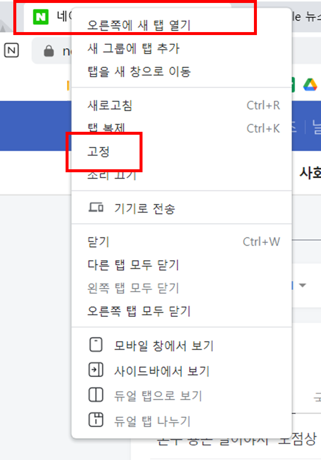 2. 고정하고 싶은 웹사이트의 탭을 우측 마우스 클릭합니다 > 고정 버튼을 클릭합니다 > 탭이 작아집니다