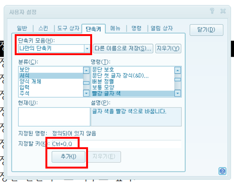 4. 새 단축키 모음 생성 > 명령에 키 지정 > 추가 > 닫기