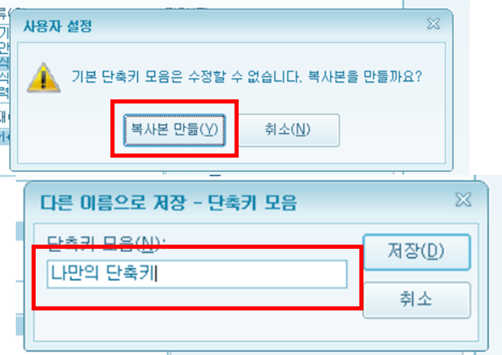 3. 기존에 있던 명령을 선택 후 지우기 > 기본 단축키 모음은 수정할 수 없으므로 복사본 만들기