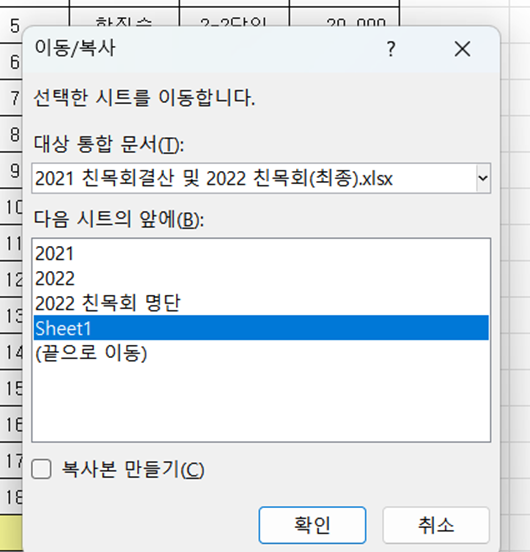 3. 옮기고자 하는 엑셀 파일 클릭합니다 > 이동하고자 하는 위치 다음의 시트 클릭