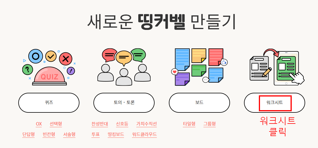 1. 아이스크림 메인 화면의 위쪽 메뉴에 띵커벨을 찾아볼 수 있다 . 2. 보드를 선택한다. 3. 타일형 / 그룹형을 선택한다. (각각 패들릿의 담벼락과 셀프 서식에 해당한다고 볼 수 있다.) 4. 템플릿