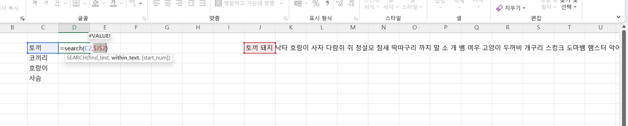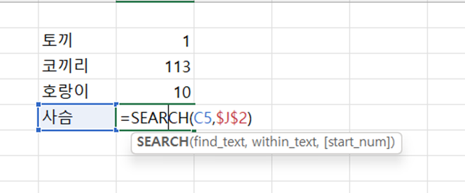 =search( 찾을 텍스트가 있는 셀(혹은 “찾고 싶은 텍스트“), 찾을 텍스트가 포함되어 있는 셀)