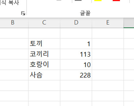 4. 왼쪽에 있는 동물이 글자 덩어리의 몇번째에 시작하는지 숫자가 정상 출력됩니다.
