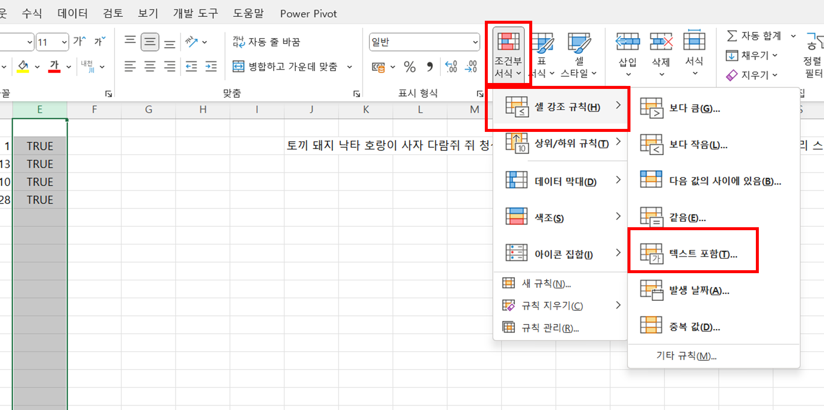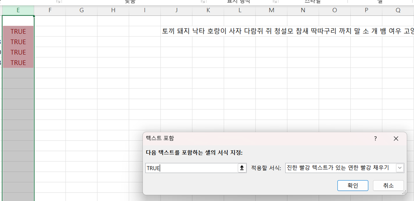 6. 조건부서식을 활용하여, TRUE 가 포함된 셀에 특정 색깔을 표시해줍니다.