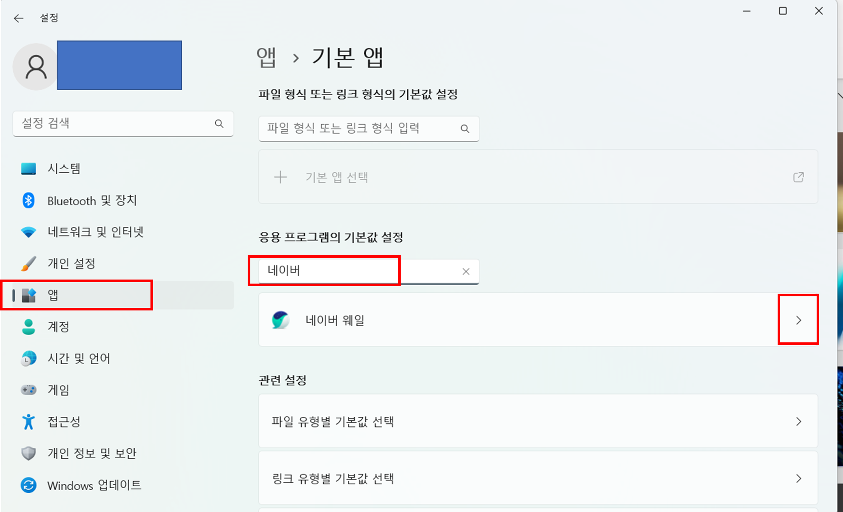 2. 설정 > 앱 > 기본앱 > 아래에 내가 원하는 브라우저를 검색하고, 화살표를 누릅니다