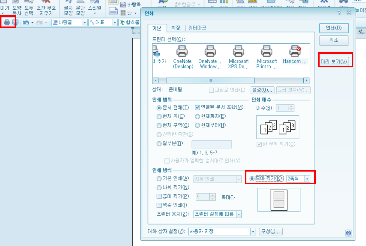 1. 인쇄 > 모아찍기 > 미리보기 확인